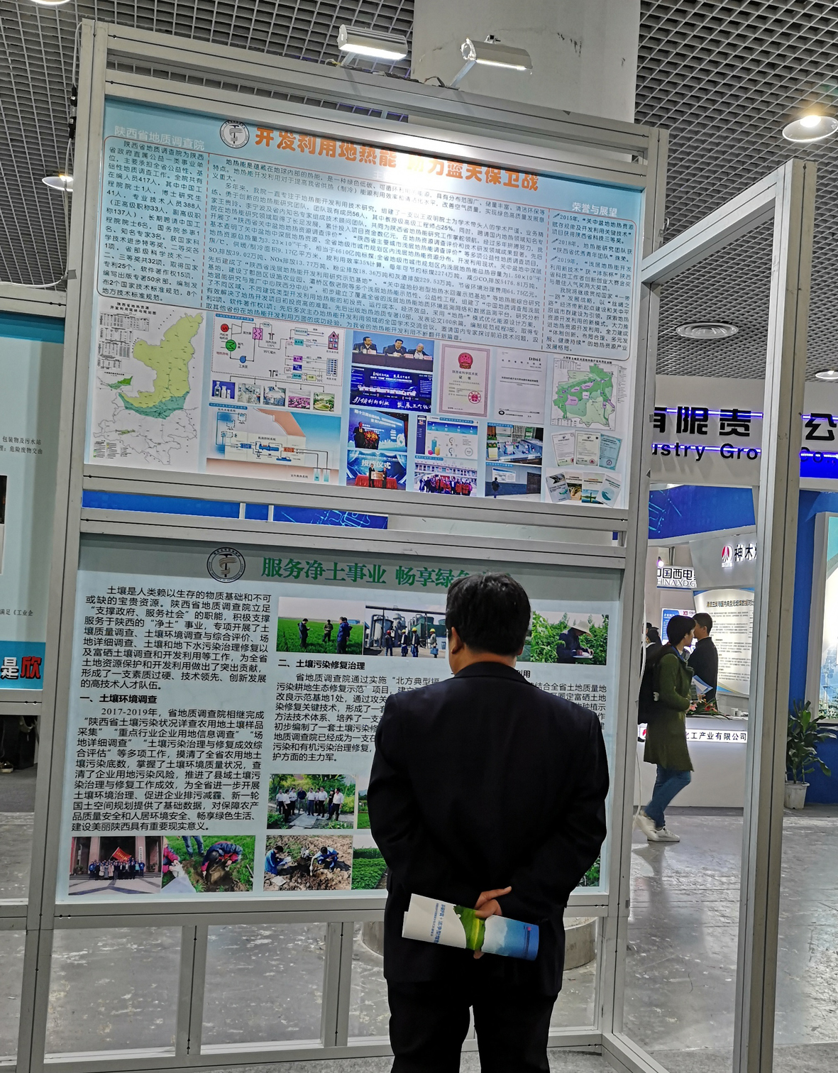 此次展會上,由陜西省水工環(huán)地質調查中心的地熱地質調查所和化探地質調查所分別制作以“開發(fā)利用地熱能 助力藍天保衛(wèi)戰(zhàn)”及“服務凈土事業(yè) 暢想綠色生活”為題的兩塊展板展出。展會期間,有多家單位和個人前來了解有關地熱地質工作和土壤治理相關專業(yè)知識和主要進展,我單位現場工作人員都予以詳細解答。通過參加此次展會,不僅助推了“綠色發(fā)展、綠色生活”的展會主題,同時較好地宣傳了我中心在相關領域的業(yè)務水平和工作成果。
