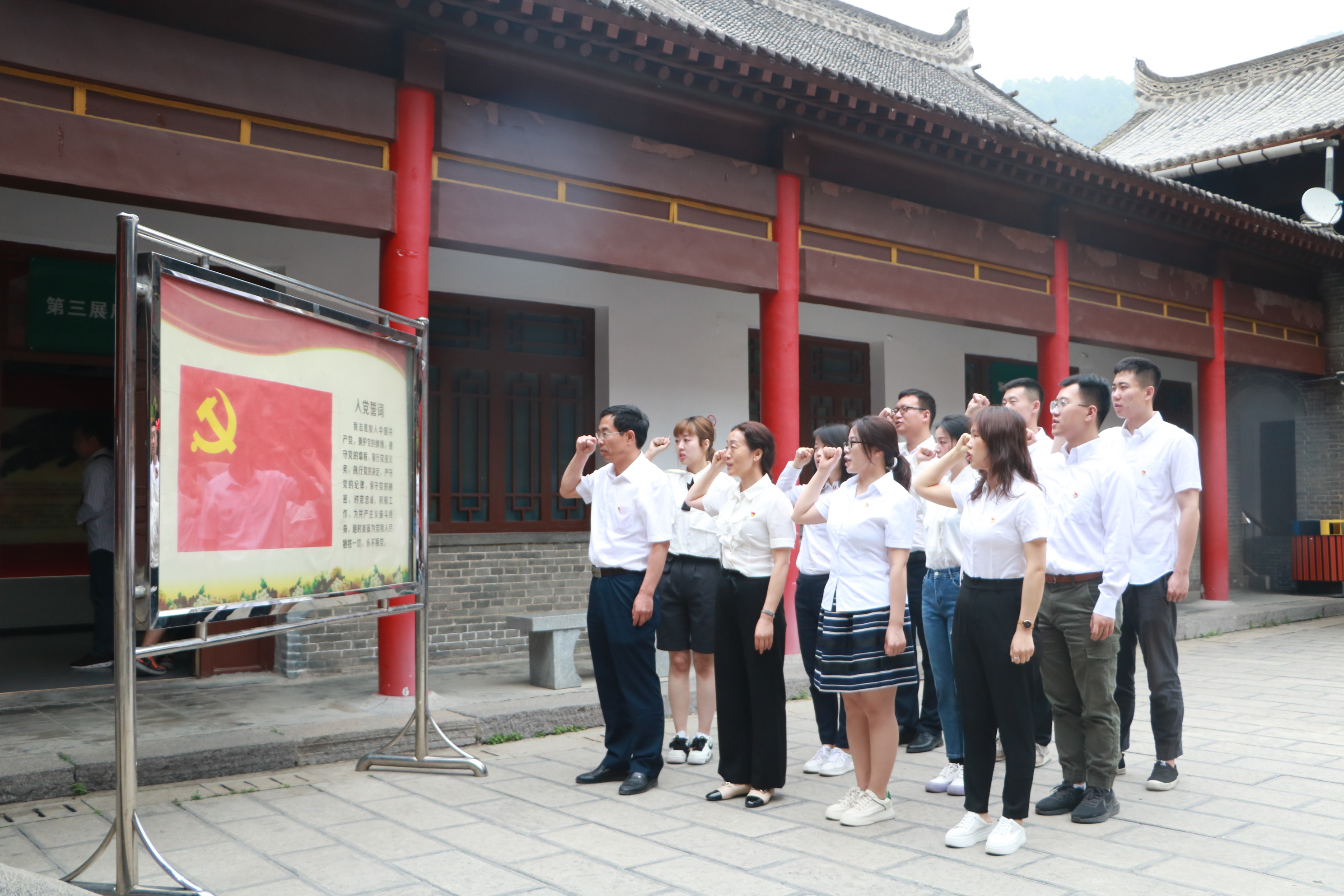 在葛牌鎮區蘇維埃紀念館,全體黨員、預備黨員面向黨旗莊嚴宣誓,重溫入黨誓詞。