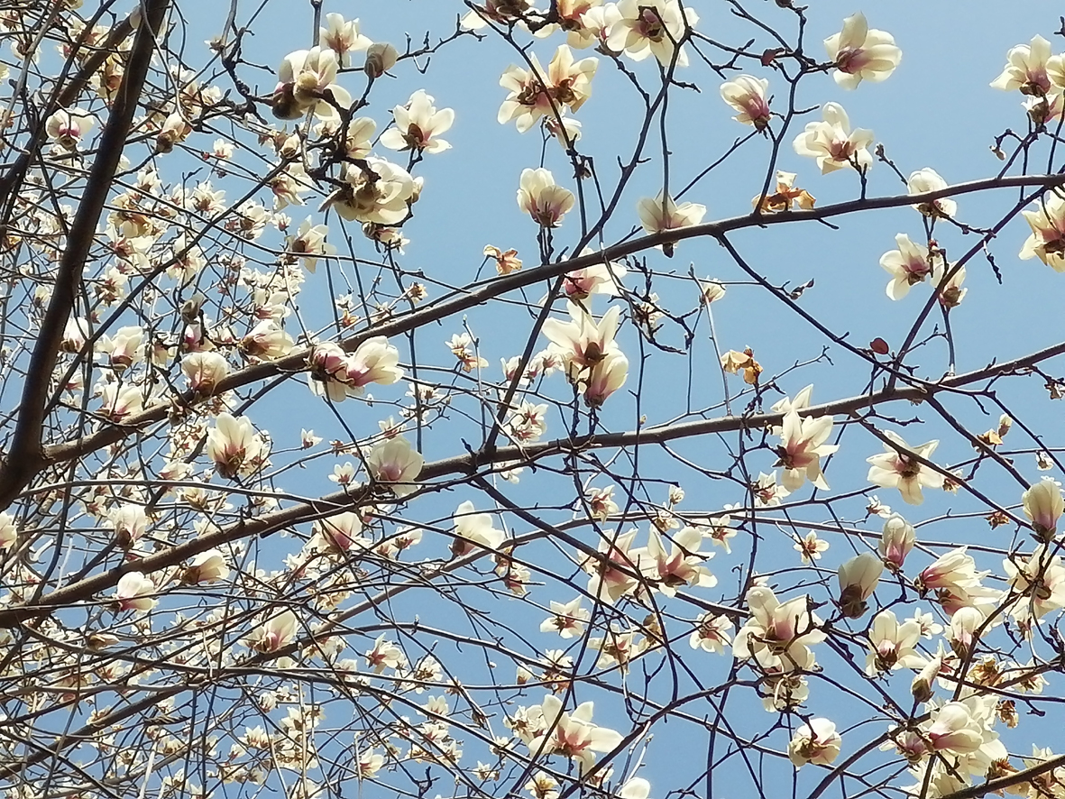 玉蘭花擠擠挨挨,一朵朵熱烈奔放,花瓣舒展明媚。如雪的白,仿佛在泉水洗滌過,片片無塵。清風徐來,花朵搖曳,千嬌百媚,姿態各異。聽,不只有風聲,還有它們啟開紅唇,向春天袒露等待和怒放的生命歷程。